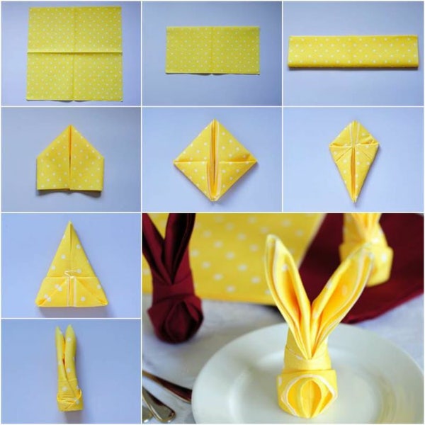 Для Великодня та дитячого Дня народження можна скласти із серветки кумедних зайченят. Для урочистих випадків цей варіант не дуже доречний, але на сімейних урочистостях легко підніме всім настрій.
